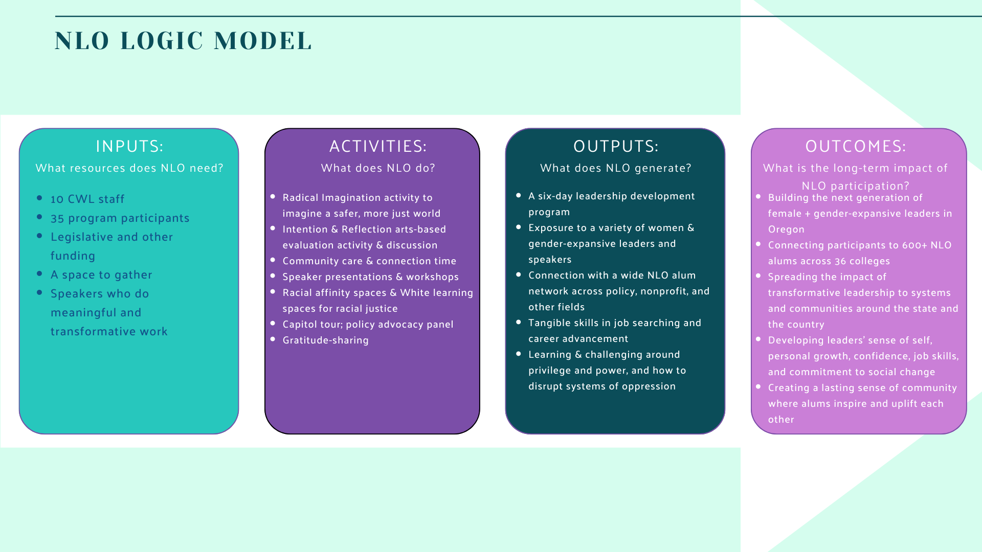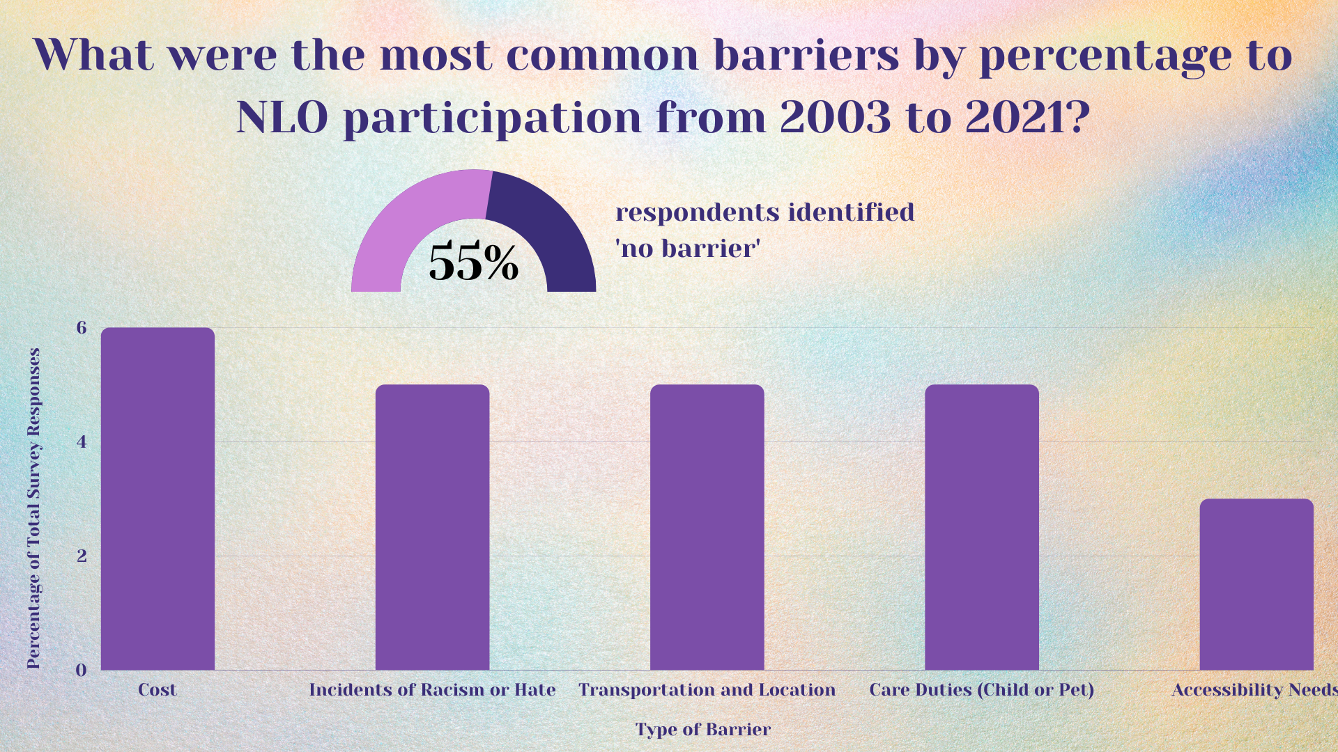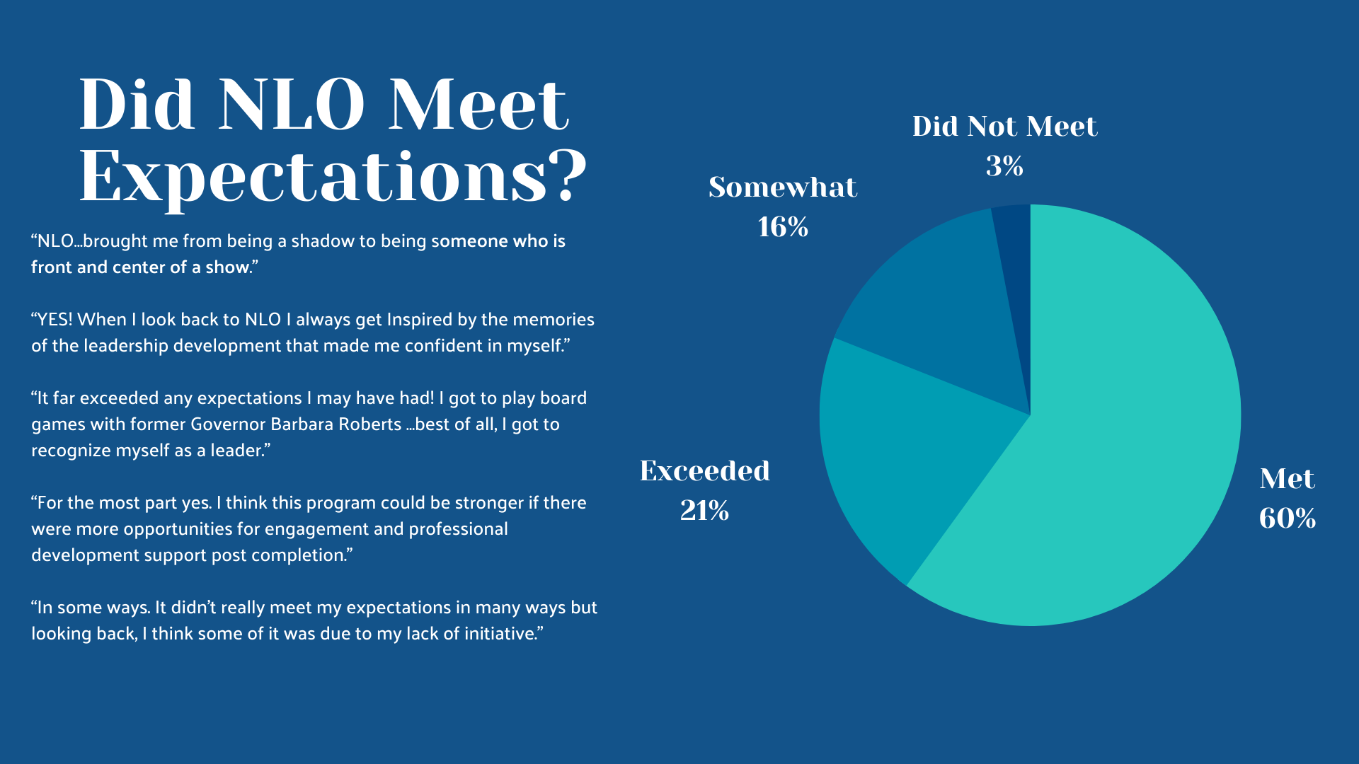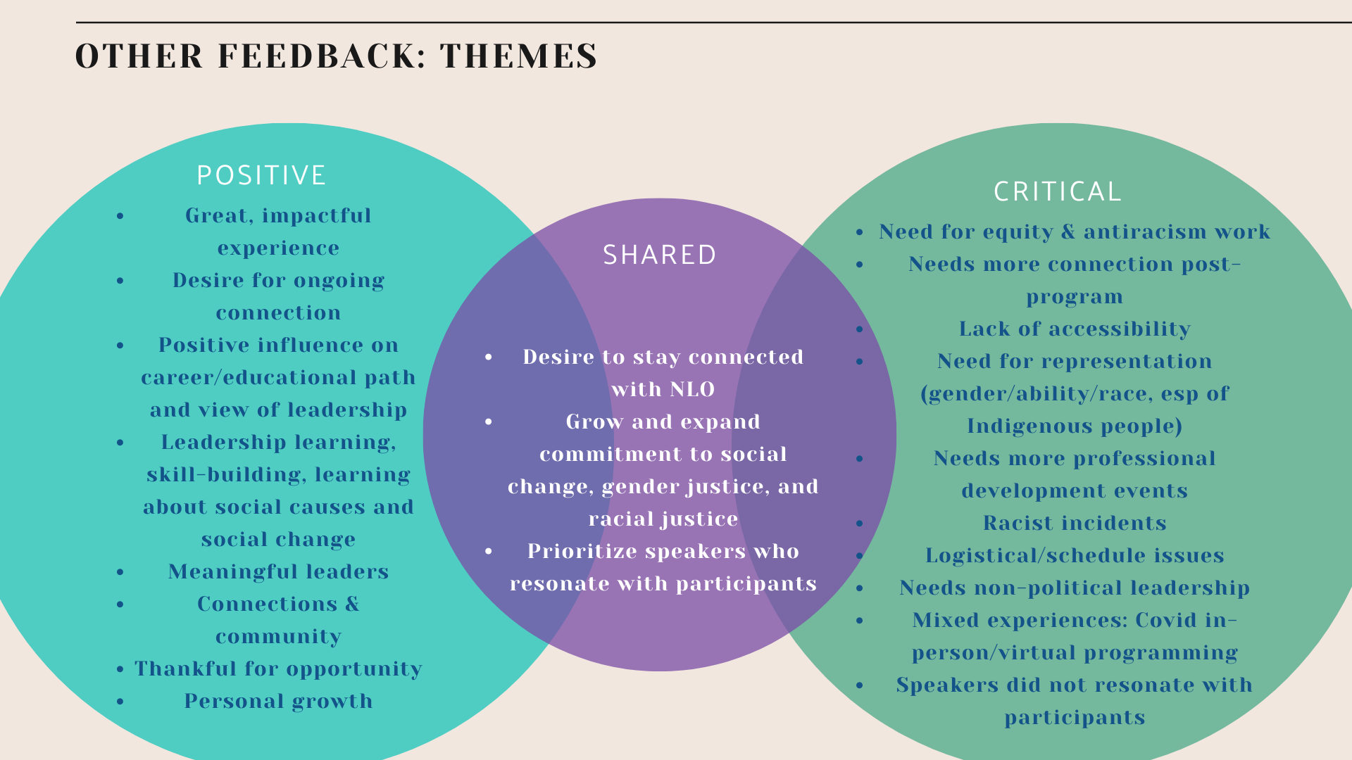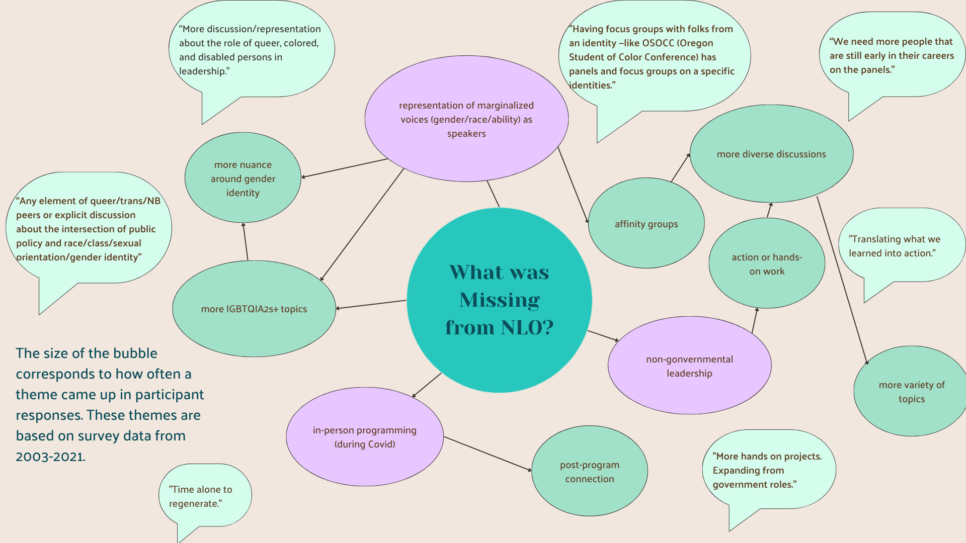 Knowing that one method will never fit all, we went about our evaluation in a few different ways. We started with a comprehensive survey for alums from 2003-2021 that sought to understand perspectives on NLO from an equity standpoint. As a team dedicated to racial and intersectional gender justice, we needed to look at participants’ experience, effects, and barriers broken down by alums’ demographics and identities, such as race, gender, and education level. Rather than isolating just one identity, we created interactive charts that would assess participant experience by intersectional identity, such as race and gender. We created interactive charts to display this comprehensive demographic data in a way that is engaging and meaningful, and we incorporated NLO 2022 data after it occurred.