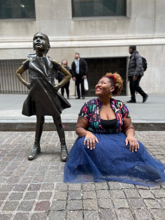 Coty Raven Morris with "Fearless Girl" sculpture in New York City
